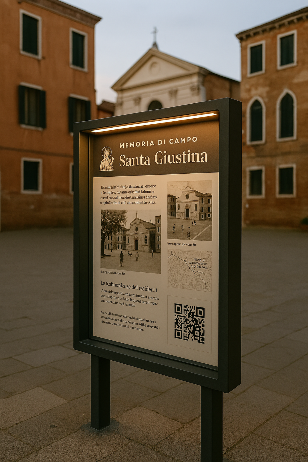 La bacheca dedicata a Santa Giustina potrebbe raccontare la storia del monastero e della chiesa, le trasformazioni del campo nel Novecento, le botteghe che un tempo animavano la zona, le feste popolari, le famiglie storiche. Una fotografia degli anni ’50 mostrerebbe il campo com’era prima delle ristrutturazioni; una mappa d’epoca evidenzierebbe il ruolo del monastero; un QR code aprirebbe un audio con la voce di una residente che racconta com’era crescere lì negli anni ’70.